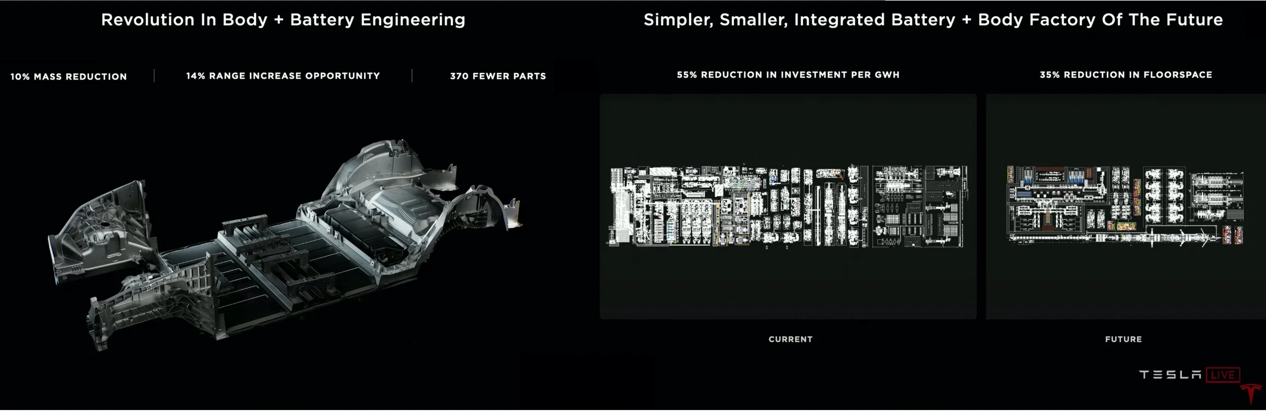 This technology results in 35% reduction in floorspace. Elon insisted on this technology as a key point forfeiture EVs. Tesla said this technology does not only give rise to a better product but also allows massive simplification (and so cost reduction) in the vehicle manufacturing process.