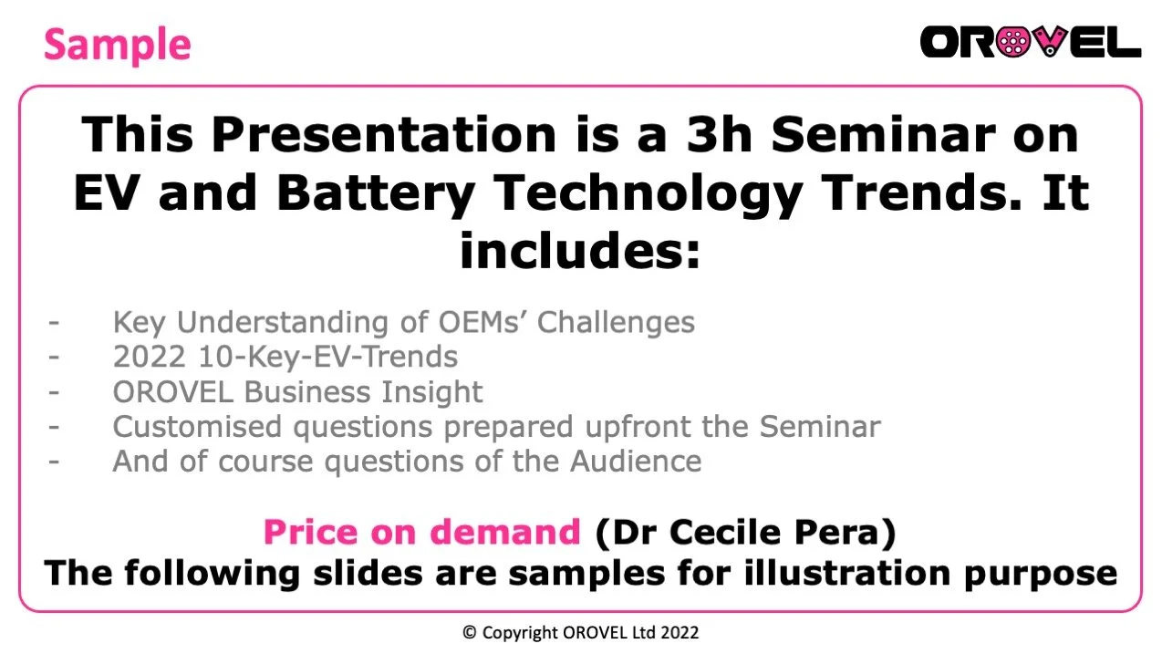 This Seminar is a 3h presentation / discussion about the 2022 Battery and EV Technology Trends based on OROVEL knowledge and expertise. You can find below some slides extracted from the Seminar which includes